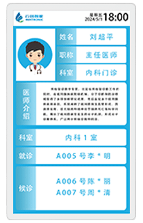 設備主要用于診室門口信息顯示,如醫生信息,就診狀態,排隊情況等。輕便易安裝,適合各診室和候診大廳