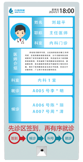 設備主要用于診室簽到、信息顯示,如醫生信息,就診狀態,排隊情況等。輕便易安裝,適合各診室和候診大廳