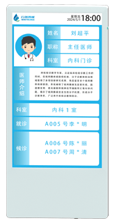 設(shè)備主要用于診室門口信息顯示,如醫(yī)生信息,就診狀態(tài),排隊情況等。輕便易安裝,適合各診室和候診大廳。